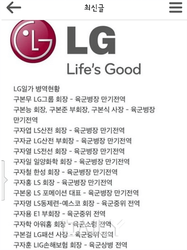 µ¶¸³±ºÀ» Áö¿øÇß´ø ±â¾÷´ä°Ô LG Àϰ¡ÀÇ º´¿ª ÇöȲµµ ÈÁ¦°¡ µÇ¾ú´Ù. ±¸º»¹« LG±×·ì ȸÀå (À°±ºº´Àå ¸¸±âÀü¿ª), ±¸º»´É ȸÀå (À°±ºº´Àå ¸¸±âÀü¿ª), ±¸º»ÁØ ºÎȸÀå (À°±ºº´Àå ¸¸±âÀü¿ª), ±¸º»½Ä »çÀå (À°±ºº´Àå ¸¸±âÀü¿ª)À» ÇʵηΠLG Àϰ¡ÀÇ °ÅÀÇ Àü ±¸¼º¿øÀÌ º´¿ª Àǹ«¸¦ ¿Ï¼öÇß´Ù. ´ëºÎºÐÀÇ ±¹³» À¯·Â ±â¾÷ Ä£Á·µéÀÌ º´¿ª ºñ¸®¿¡¼ ÀÚÀ¯·ÓÁö ¸øÇÑ °Í°ú ºñ±³µÇ¸é¼ ³×ƼÁðµé·ÎºÎÅÍ ¸¹Àº Âù»ç¸¦ ¹Þ´Â ºÎºÐÀÌ´Ù.