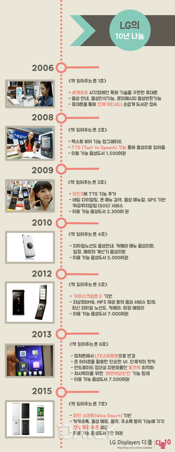LGÀüÀÚ´Â ½Ã°¢Àå¾ÖÀεéÀ» À§ÇÑ Áö¿ø¿¡µµ Èû¾²°í ÀÖ´Ù. 2006³âºÎÅÍ LGÀ¯Ç÷¯½º, LG»ó³²µµ¼°ü µî°ú ÇÔ²² ½Ã°¢Àå¾ÖÀÎÀ» À§ÇÑ Àü¿ë ÈÞ´ëÆùÀ» °³¹ß, 2013³â±îÁö ¾à 1¸¸2,000´ë¸¦ ±âÁõÇß´Ù. 2015³â¿¡µµ ½Ã°¢Àå¾ÖÀÎ¿ë ½º¸¶Æ®ÆùÀÎ ¡®Ã¥ ÀоîÁÖ´Â Æù¡¯ ½ÅÁ¦Ç°À» °³¹ß, ÇÏ»óÀå¾ÖÀκ¹Áö°üÀ» ÅëÇØ ½Ã°¢Àå¾ÖÀÎ 2,500¸í¿¡°Ô ±âÁõÇÑ ¹Ù ÀÖ´Ù. 2010³âºÎÅÍ LGÀüÀÚÀÇ ¡®Ã¥ ÀоîÁÖ´Â Æù¡¯À» »ç¿ëÇØ ¿Â °¡¼ö °â ¹è¿ì À̵¿¿ì¾¾(1±Þ ½Ã°¢Àå¾Ö)´Â ¡°½Ã°¢Àå¾ÖÀÎÀ» À§ÇÑ µû¶æÇÑ ¹è·Á°¡ ´À²¸Áö´Â Á¦Ç°À̶ó ¿À·§µ¿¾È ¡®Ã¥ ÀоîÁÖ´Â Æù¡¯À» »ç¿ëÇϰí ÀÖ´Ù¡±¸ç ¡°½Ã°¢Àå¾ÖÀεéÀÌ ¼¼»ó°ú ´õ ½±°í ÆíÇÏ°Ô ¼ÒÅëÇÒ ¼ö ÀÖµµ·Ï Á¦Ç°À» Áö¼Ó °³¹ßÇϰí Àü´ÞÇØ Áּа¨»çÇÏ´Ù¡±°í °í¸¶¿òÀ» Ç¥½ÃÇß´Ù.