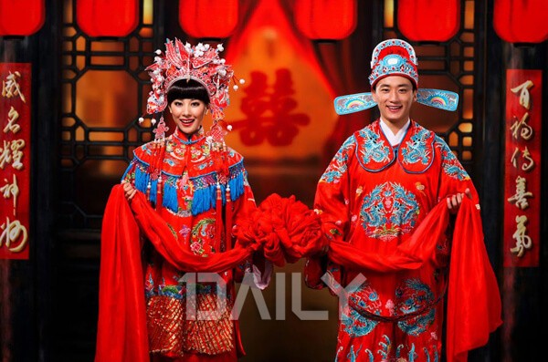 ¼ø¹éÀÇ ¿þµùµå·¹½º´Â ±Ý¼¼ ÀÌÈ¥ÇÑ´Ù´Â ¹Ì½ÅÀÌ Àֱ⠶§¹®¿¡ ºÎ¿Í ¹ø¿µÀÇ »ó¡ÀÎ ºÓÀº»öÀÇ ÀüÅë ÀÇ»óÀÎ Ä¡ÆÄ¿À¸¦ ÀԴ´Ù. Áß±¹ÀÇ °áÈ¥½Ä¿¡´Â ÁÖ·Ê¿Í Áַʻ簡 ¾øÀÌ °áÈ¥ Áõ¸í¼¸¦ ³¶µ¶ÇÏ´Â °ÍÀ¸·Î ³¡³ª´Âµ¥ ÀÌÈÄ ÇǷο¬À» È·ÁÇÏ°í ¼º´ëÇÏ°Ô ÇÑ´Ù. À̶§ ÇǷο¬ Å×ÀÌºí¿¡´Â ÄÚ½º¿ä¸®¿Í ÇÔ²² ¼ú, ´ã¹è, »çÅÁ ¼¼ °¡Áö°¡ ¹«Á¶°Ç ¿Ã¶ó¿Â´Ù. »çÅÁÀÇ Àǹ̴ °áÈ¥½Ä¿¡ ¿Â Çϰ´µé¿¡°Ô ´ÞÄÞÇÔÀ» ÀüÇØÁÖ±â À§Çؼ, ´ã¹è´Â À̳¯ÀÇ ±â»ÝÀÌ ´ã¹è ¿¬±âó·³ ÆÛÁ® ³ª°¡±æ Èñ¸ÁÇÏ´Â Àǹ̶ó°í ÇÑ´Ù.