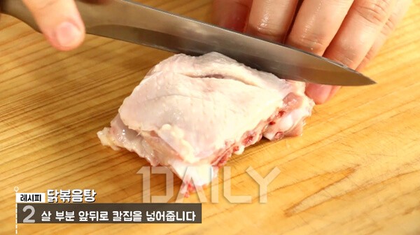 ºÒ¼ø¹°À» ±ú²ýÀÌ ¾Ä¾î ÁغñÇÑ ´ß°í±â¿¡ ºÙ¾îÀÖ´Â »ì ºÎºÐ¿¡ ¾ÕµÚ·Î Ä®ÁýÀ» ³Ö¾îÁØ´Ù. ÀÌ·¸°Ô °í±âÀÇ ¾ÕµÚ ºÎºÐ¿¡ Ä®ÁýÀ» Á¶±Ý¾¿ ³Ö¾îÁÖ¸é ¾ç³äÀ» ³Ö¾úÀ» ¶§ °£ÀÌ »ì ¾ÈÂʱîÁö ¹è¾îµç´Ù. µû¶ó¼ °í±â ¼Ó±îÁö °£ÀÌ Àß ¹ê ´õ ¸ÅÄÞÇÏ°í ¸ÀÀÖ´Â ´ßººÀ½ÅÁÀÌ µÈ´Ù.