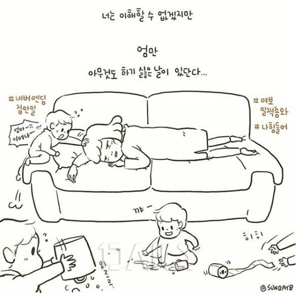 ¡®½ãºñ¡¯´Â ÀÛ°¡ ÀÚ½ÅÀÎ ³ë¶õ ´Ü¹ß¸Ó¸® ¾ö¸¶¿Í ³ë¶õ °ö½½¸Ó¸® ¾Æ±â ¸¶¿ä¸¦ ÁÖÀΰøÀ¸·Î ±×¸° À°¾ÆÅ÷ÀÌ´Ù. ¾Æºü Á¶¿¤Àº °¾ÆÁö·Î µîÀåÇÑ´Ù. ´ã¹éÇÑ ±¸Á¶¿¡ ¼ö¸¹Àº °¨Á¤°ú ±ú¹°¾îÁÖ°í ½ÍÀº ±Í¿©¿î ¾Æ±âÀÇ ¸ð½ÀÀº »ç¶ûÇÏÁö ¾ÊÀ» ¼ö ¾ø´Ù. ½ãºñ´Â ¼¼ »ì ¾Æ±â ¡®¸¶¿ä¡¯¸¦ µÐ ¾ö¸¶ÀÌÀÚ µðÀÚÀ̳ʷΠ¡®³ÊÀÇ ¸ðµç ¼ø°£À» ±â¾ïÇÒ°Ô¡¯ ù ¹øÂ° Àü½Ãȸ¸¦ ¿¾ú°í, ¡®½ãºñÀÇ ±×¸²Àϱ⡯´Â À°¾ÆÈú¸µºÏ ¡®#¿ùȼö¸ñÀ°¾Æ¡¯·Î Ãâ°£µÆ´Ù.