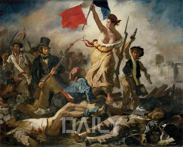 '¹ÎÁßÀ» À̲ô´Â ÀÚÀ¯ÀÇ ¿©½Å'Àº 1830³â ÇÁ¶û½ºÀÇ 7¿ù Çõ¸íÀ» ¹¦»çÇß´Ù. Àι°µéÀÌ »ï°¢±¸µµ¸¦ ¶ì°í ÀÖ´Â ÀÌ ÀÛǰÀÇ °¡Àå Å« Æ÷ÀÎÆ®´Â ¹Ù·Î ÀÚÀ¯ÀÇ ¿©½ÅÀÌ µé°í ÀÖ´Â »ï»ö±âÀÌ´Ù. ÀÚÀ¯, Æòµî, ¹Ú¾Ö¸¦ »ó¡ÇÏ´Â »ï»ö±â´Â ÇÁ¶û½ºÀÇ ±¹±âÀÎ ¸¸Å ±²ÀåÈ÷ »ó¡ÀûÀÎ ÀÛǰÀ̶ó°í ÇÒ ¼ö ÀÖ´Ù. ¶ÇÇÑ Àç¹ÌÀÖ´Â Á¡Àº ÁßÀý¸ð¸¦ ¾²°í ÃÑÀ» µç »ç¶÷ÀÌ ¹Ù·Î µé¶óÅ©·ç¾Æ Ȱ¡ ÀÚ½ÅÀÇ ¸ð½ÀÀ̶ó´Â °ÍÀÌ´Ù. Çõ¸í¿¡ µ¿ÂüÇÏ´Â ¸ð½ÀÀ» ±×·È´Ù°í ÇÒ ¼ö ÀÖ´Ù.