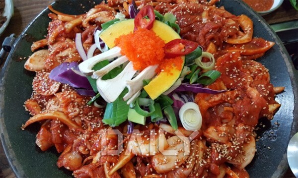 Ç»Àü«»ÍÁýÀÎ ¼¶¼Ò³ªÀÌ´Â 12½Ã°£ µ¿¾È Á¤¼º µé¿© ²úÀÎ À°¼ö¿¡, ÅêÀ¸·Î ¸é°ú ÇÇÀÚ µµ¿ì¸¦ ¸¸µé¾î ¿ìµµ ¹Ù´ÙÀÇ ¸ÀÀ» ±×´ë·Î º¸¿©ÁØ´Ù. °Ô´Ù°¡ Á¦ÁÖµµ¿¡¼ ¸Àº¼ ¼ö ÀÖ´Â ¸ö±¹ÀÇ ÁÖÀç·áÀÎ ¸ðÀÚ¹ÝÀÌ Â«»Í¿¡ ¿Ã¶ó°¡ Ưº°ÇÔÀ» ´õÇÑ´Ù. «»Í°ú ÇÇÀÚÀÇ Á¶ÇÕÀÌ ´Ù¼Ò ¾î»öÇÏ°Ô ´À²¸Áú ¼ö ÀÖÁö¸¸, ¾óÅ«ÇÑ Â«»ÍÀÇ ¸Å¿î¸ÀÀ» Ä¡Áî·Î ÁßȽÃų ¼ö ÀÖ¾î ÀǿܷΠÁÁÀº ±ÃÇÕÀ̶ó´Â ÆòÀÌ ¸¹´Ù.