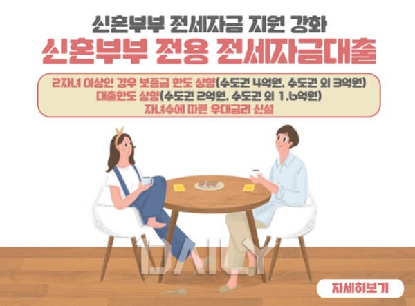 ½ÅÈ¥ºÎºÎ Àü¼¼ÀڱݴëÃâ Áö¿ø Á¦µµ´Â ½ÅÈ¥ºÎºÎÀ̰ųª ¶Ç´Â ¿¹½ÄÀå °è¾à¼°¡ ÀÖ´Â °áÈ¥ ¿¹Á¤ÀÚ·Î ¹«ÁÖÅÃÀÚÀÏ ¶§ ½ÅûÀÌ °¡´ÉÇÏ´Ù. ½ÅÈ¥ºÎºÎ Àü¼¼ÀڱݴëÃâÀÇ Çѵµ´Â ¼öµµ±ÇÀÇ °æ¿ì ÃÖ´ë 3¾ï ¿ø ÀÌÇÏÀÌ¸ç ¼öµµ±Ç ÀÌ¿Ü Áö¿ªÀº 2¾ï ¿ø±îÁöÀÌ´Ù. ±Ý¸®ÀÇ °æ¿ì ¿¬ºÀÇÕ»ê°ú º¸Áõ±ÝÀÇ Çѵµ¿¡ µû¶ó Á¶±Ý Â÷À̰¡ ³ª´Âµ¥ ¿¬ 2.3%¿¡¼ 2.9% Á¤µµÀÌ´Ù.