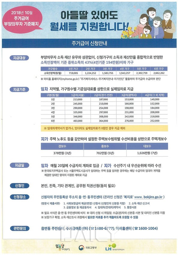 ÀÓÂ÷°¡±¸ Áö¿øÀº ÁְžÈÁ¤¿¡ ÇÊ¿äÇÑ ÀÓÂ÷·á¸¦ Áö¿ø¹ÞÀ» ¼ö ÀÖ´Â Á¦µµÀÌ´Ù. ½ÇÁ¦·Î´Â ¿ù¼¼³ª ÀÓÂ÷ ºñ¿ëÀ» ÀÌ Á¦µµ¸¦ ÅëÇØ Áö¿ø¹ÞÀ» ¼ö ÀÖ´Ù. ÀÓÂ÷°¡±¸ Áö¿øÀ» ½ÅûÇÏ·Á¸é Á¶°ÇÀº ¼ÒµæÀÎÁ¤¾×ÀÌ ÁßÀ§¼ÒµæÀÇ 43% ÀÌÇÏÀÌ¸é¼ ºÎ¾ç Àǹ«ÀÚÀÏ ¶§ °¡´ÉÇÏ´Ù. ½ÅûÀ» Çϱâ À§Çؼ´Â À¾, ¸é, µ¿ Áֹμ¾Å͸¦ ¹æ¹®ÇÏ¿© »ó´ãÀ» ¹Þ°í ½ÅÃ»ÇØ¾ß ÇÑ´Ù.