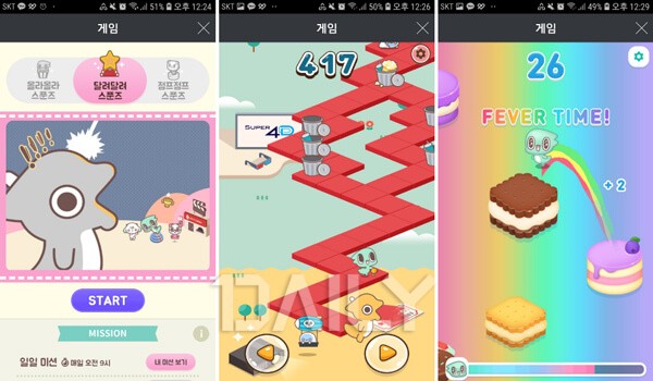 ¿µÈ¸¦ »ç¶ûÇÏ´Â À̵éÀ̶ó¸é ÇϳªÂë ½º¸¶Æ®Æù¿¡ ¼³Ä¡µÇ¾î ÀÖÀ»¹ýÇÑ ·Ôµ¥½Ã³×¸¶ °ø½Ä ¾Û¿¡¼µµ HTML5 °ÔÀÓÀ» Áñ±æ ¼ö ÀÖ´Ù. ÇØ´ç ¾Û¿¡¼´Â '¿Ã¶ó¿Ã¶ó ½ºÇ¬Áî', '´Þ·Á´Þ·Á ½ºÇ¬Áî', 'Á¡ÇÁÁ¡ÇÁ ½ºÇ¬Áî'ÀÇ ÃÑ ¼¼°¡Áö °ÔÀÓ ½Ã¸®Á ¼ºñ½ºÇϰí ÀÖ´Ù. ±Í¿©¿î ij¸¯Å͸¦ ÅÍÄ¡ ¸¸À¸·Î °£´ÜÇÏ°Ô Á¶Á¾ÇØ ¸ñÇ¥ÇÏ´Â °÷¿¡ µµ´Þ½ÃŰ´Â °ÔÀÓÀε¥, Áßµ¶¼ºÀÌ »ó´çÇØ ¾î¸° ¾ÆÀ̵鿡°Ô ƯÈ÷ »ç¶ûÀ» ¹Þ°í ÀÖ´Ù. ¶ÇÇÑ °ÔÀÓÀÇ ¹Ì¼ÇÀ» ¸ðµÎ ´Þ¼ºÇÏ¸é ·ê·¿À» µ¹·Á ·£´ý º¸»óÀ» ¾òÀ» ¼ö Àִµ¥, ÀÌ º¸»ó¿¡´Â ¿µÈ°ü¶÷±Ç°ú ÆËÄÜ ±³È¯±Ç µîÀÌ Æ÷ÇԵǾî ÀÖ¾î °ÔÀÓ »Ó¸¸ ¾Æ´Ï¶ó ¿µÈ±îÁö ¹«·á·Î Áñ±æ ¼ö ÀÖ´Â ±âȸ°¡ Á¦°øµÈ´Ù. ¾Æ¿ï·¯ º°µµÀÇ È½¼öÁ¦ÇÑÀÌ ¾ø¾î Æ÷ÀÎÆ® ¼ÒÁøÀ̳ª ÃæÀü ¾øÀÌ ¹«Á¦ÇÑÀ¸·Î °ÔÀÓÀ» Áñ±æ ¼ö ÀÖ´Ù´Â ÀåÁ¡ÀÌ µ¸º¸ÀδÙ.
