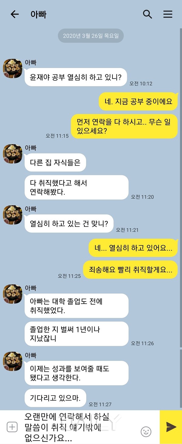 Ä£±¸¿¡°Ô Ãë¾÷ °ü·ÃÇØ¼ »óó µÇ´Â ¸»À» µéÀ¸¸é Ãë¾÷ÀÌ µÉ ¶§±îÁö ¸¸³ªÁö ¾Ê°Å³ª ¿¬¶ôÀ» ¸Ö¸®ÇÏ¸é ±×¸¸ÀÌÁö¸¸, °¡Á·¿¡°Ô »óó µÇ´Â ¸»À» µéÀ¸¸é ±× ´©°¡ ÇÏ´Â ¸»º¸´Ù ½Å°æ ¾²ÀÏ ¼ö¹Û¿¡ ¾ø´Ù. °¡Àå °¡±î¿î °÷¿¡¼ ¹öÆÀ¸ñÀÌ µÇ¾îÁÖ°í »óó¹Þ¾ÒÀ» ¶§ ±â´î ¼ö ÀÖ´Â Á¸Àç°¡ °¡Á·À̶ó°í »ý°¢Çߴµ¥, °¡Á·ÀÌ ÁÖ´Â »óó´Â ´©±¸¿¡°Ôµµ À§·Î¹ÞÀ» ¼ö ¾ø±â ¶§¹®ÀÌ´Ù. ƯÈ÷ Ãë¾÷ÀÌ ¾È µÅ¼ ¾È ±×·¡µµ ºÎ¸ð´Ô²² Á˼ÛÇÑ ¸¶À½À» °¡Áö°í Àִµ¥, ºÎ¸ð´ÔÀÌ '´©±¸´Â ÃëÁ÷ÇØ¼ ¿ëµ·µµ Áشٴõ¶ó', '´©±¸´Â ´ë±â¾÷¿¡ °¬´Ù´õ¶ó'¶ó´Â ½ÄÀ¸·Î ºñ±³ÇÏ¸é ¼·¯¿î °¨Á¤Àº ¹è°¡ µÈ´Ù.