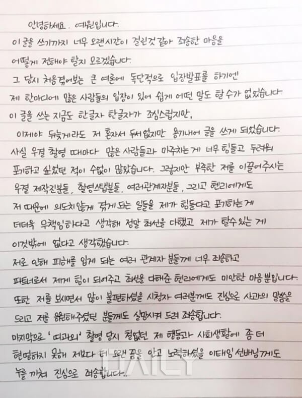 ÀÌ¿¡ ¡°±×·¡µµ ¿å¼³À» ÇÑ ÀÌÅÂÀÓÀÌ À߸øÇß´Ù¡±, ¡°¾Æ´Ï´Ù. ÀϹæÀûÀÎ ÇÇÇØÀÚÀΠô ¾ð·Ð Ç÷¹À̸¦ ÇÑ ¿¹¿øÀÌ À߸øÇß´Ù¡±¶ó¸ç ´©¸®²Ûµé »çÀÌ¿¡ ¼³ÀüÀÌ ¹ú¾îÁ³°í »çÅ´ ÀÏÆÄ¸¸ÆÄ·Î ÆÛÁ® ³ª°¬´Ù. ÇÏÁö¸¸ ¿¹¿øÀº ½ÃûÀÚµéÀÇ ÇÏÂ÷ ¿ä±¸°¡ ½ñ¾ÆÁü¿¡µµ ºÒ±¸, ÀÌÈķεµ °è¼Ó MBC <¿ì¸® °áÈ¥Çß¾î¿ä>¿¡ Ã⿬Çß´Ù. ±×¸®°í ±×·ÎºÎÅÍ 2°³¿ù ÈÄ, µåµð¾î ¿¹¿øÀÌ ÇØ´ç »ç°Ç¿¡ ´ëÇØ »ç°ú¹®À» ¿Ã·È´Ù. "¿ì°á ÃÔ¿µ ¶§¸¶´Ù Æ÷±âÇÏ°í ½Í¾ú´ø ÀûÀÌ ¼ö¸¹¾Ò´Ù ±×·¯³ª ºÎÁ·ÇÑ Àú¸¦ À̲ø¾î Áֽô Á¦ÀÛÁøºÐµé, ÃÔ¿µ ½ºÅÂÇÁµé°ú Ç¸¦ »ý°¢ÇÏ¸é ³¡±îÁö ÃÔ¿µ¿¡ ÀÓÇÏ´Â °Ô Ã¥ÀÓÀ» Áö´Â °ÍÀ̶ó »ý°¢Çß´Ù¡±¶ó´Â °ÍÀÌ ±× ³»¿ëÀ̾ú´Ù. À̾î "»çȸ»ýȰÀ» Çö¸íÇÏ°Ô ÇÏÁö ¸øÇÑ Ã¶¾ø´Â Á¦ ÇൿÀ¸·Î ÀÌÅÂÀÓ ¼±¹è´Ô²²µµ ´©¸¦ ³¢ÃÄ Áø½ÉÀ¸·Î Á˼ÛÇÏ´Ù"¶ó°í »ç°úÇß´Ù. ±×·¯³ª ¿¹¿øÀÇ »ç°ú¿¡µµ ½Î´ÃÇØÁø ºÐÀ§±â´Â ±×´ÙÁö ´Þ¶óÁöÁö ¾Ê¾Ò´Ù. ÀÌ¿¡ ¿¹¿øÀº ºÒ°¡ÇÇÇÏ°Ô ¹æ¼ÛÀ» Áß´ÜÇÒ ¼ö¹Û¿¡ ¾ø¾ú´Ù.
