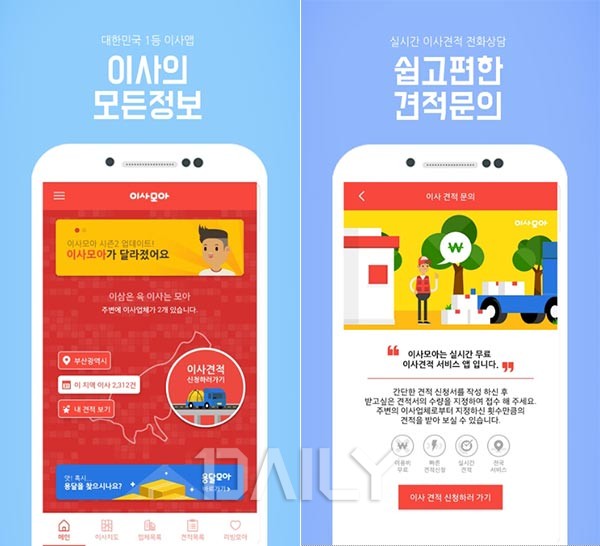 ȨÄÉ¾î ¼ºñ½º ¾Û ¡®ÀÌ»ç¸ð¾Æ¡¯´Â ±¹³» 1À§ÀÇ ÀÌ»ç O2O¾ÛÀ¸·Î, 600°³ ÀÌ»óÀÇ Àü±¹ ÀÌ»ç¾÷ü¿ÍÀÇ Á¦ÈÞ¸¦ ÅëÇØ ÀÌ»ç¾÷ü ºñ±³°ßÀûÀ» ÅëÇÑ ÀÌ»ç ¼ºñ½º¸¦ Á¦°øÇϰí ÀÖ´Ù. ´Ù¸¥ ¾îÇÿ¡ ºñÇØ ±ò²ûÇØ º¸±â ÆíÇϸç, ÀÚ½ÅÀÌ ¿øÇÏ´Â °¡°Ý ¼±¿¡¼ ÀÌ»ç ±Ý¾×À» ¾Ë¾Æº¼ ¼ö ÀÖ¾î À¯¿ëÇÏ´Ù. ÀÏÀÏÀÌ Àüȸ¦ °É°Å³ª ¹ßǰÀ» ÆÈÁö ¾Ê¾Æµµ µÇ±â ¶§¹®¿¡ ¸¹Àº »ç¶÷µéÀÌ ÀÌ¿ëÇϰí ÀÖÀ¸¸ç, Àü¹®°¡°¡ Á÷Á¢ Áý¿¡ ¹æ¹®ÇÏÁö ¾Ê¾Æµµ ¹Ù·Î ¹Ù·Î ÀÌ»ç °ßÀûÀ» ¹Þ¾Æº¼ ¼ö ÀÖ´Ù.