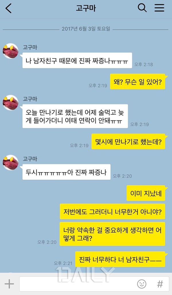 ¿¬¾Ö ÁßÀΠ챏µé Áß¿¡¼ Á¾Á¾ Ä«ÅåÀ¸·Î ¿¬¾Ö»ó´ãÀ» Çϴ ģ±¸µéÀÌ ÀÖ´Ù. ¿¬ÀΰúÀÇ ¹®Á¦ ¶§¹®¿¡ °ñÄ¡ ¾ÆÆÄÇÏ´Ù°¡ Á¶¾ðÀ» ¾ò±â À§ÇØ Á¦»ïÀÚÀÎ ³ª¿¡°Ô ¿¬¾Ö»ó´ãÀ» ÇÏ´Â °ÍÀ̶ó¸é ¾ðÁ¦µçÁö ±Í ±â¿ï¿© µé¾îÁÙ ¼ö ÀÖ´Ù. ÇÏÁö¸¸ °¡²û 'ÀÌ·² °Å¸é ³ªÇÑÅ× ¿¬¾Ö»ó´ãÀ» ¿Ö ÇÏ´Â °Å´Ï?'¶ó´Â »ý°¢ÀÌ µé°Ô Çϴ ģ±¸µéÀÌ ÀÖ´Ù. Ä«ÅåÀ¸·Î ¿¬¾Ö»ó´ãÀ» ¿äûÇÏ¸é¼ Àº±ÙÈ÷ Â¥ÁõÀ» À¯¹ßÇϴ ģ±¸µéÀÇ À¯ÇüÀ» ¾Ë¾Æº¸ÀÚ.