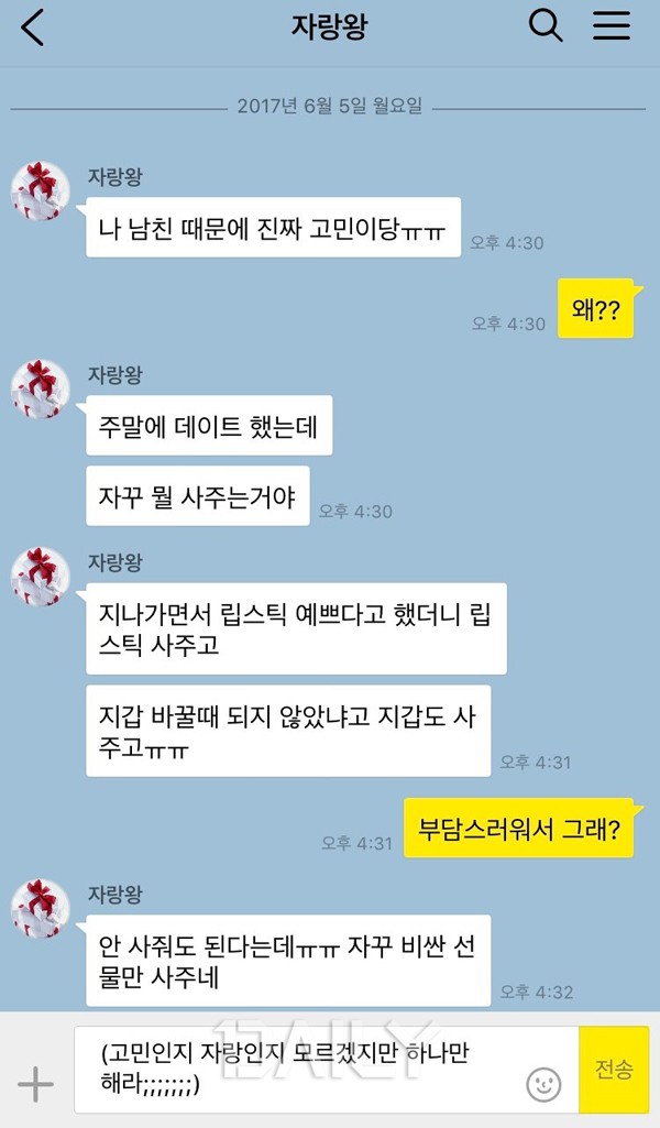 °¡²û¾¿ 'ÀÌ°Ô ÁøÂ¥ °í¹Î°Å¸®ÀÎÁö, ÀÚ¶ûÀÎÁö ¸ð¸£°Ú³×'¶ó´Â »ý°¢ÀÌ µå´Â °í¹ÎÀ» Åоî³õ´Â Ä£±¸µéÀÌ ÀÖ´Ù. ¿¹¸¦ µé¸é "³²ÀÚÄ£±¸°¡ ÀÚ²Ù ºÎ´ã½º·´°Ô ºñ½Ñ ¼±¹°À» »çÁà."¶ó´ø°¡ "³²ÀÚÄ£±¸°¡ ÀÚ²Ù ¿¬¿¹ÀÎ ´à¾Ò´ë" µî °í¹ÎÀÎÁö ÀÚ¶ûÀÎÁö ½±°Ô ±¸ºÐÀÌ µÇÁö ¾Ê´Â À̾߱⸦ °í¹ÎÀ̶ó¸ç ¿¬¾Ö»ó´ãÀ» ¿äûÇÑ´Ù. óÀ½ ÇѵΠ¹øÀº °í¹ÎÀ̶ó°í »ý°¢Çؼ µé¾îÁÙ ¼ö ÀÖ´Ù. ÇÏÁö¸¸ ¹Ýº¹Çؼ ÀÌ·± À̾߱⸦ ´Ã¾î³õ´Â Ä£±¸¸¦ º¸¸é Áø½ÉÀ¸·Î ¹¯°í ½Í´Ù. Á¤¸» °í¹ÎÀ̶ó°í »ý°¢ÇÏ´Â °ÇÁö, Àº±ÙÈ÷ µ¹·Á¼ ÀÚ¶ûÀ» ÇÏ°í ½ÍÀº °ÇÁö.