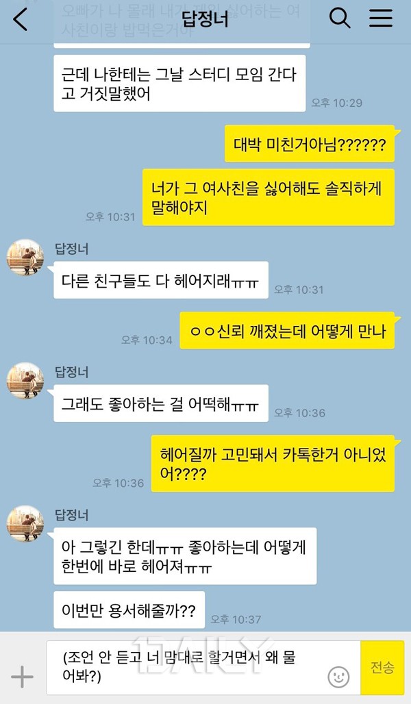 '´äÀº Á¤ÇØÁ® ÀÖ¾î, ³Ê´Â ±× ´äÀ» ¸»ÇØÁÖ¸é µÅ.'¶ó´Â ¹æ½ÄÀ¸·Î ¿øÇÏ´Â ´äÀ» µè±â À§ÇØ ²÷ÀÓ¾øÀÌ ³ë·ÂÇÏ´Â À¯ÇüÀÌ´Ù. Ä£±¸ÀÇ À̾߱⸦ µé¾îº¸¸é Çì¾îÁö±â ÃæºÐÇÑ ÀÌÀ¯Àε¥, Á¤ÀÛ ´ç»çÀÚÀΠ챏´Â Çì¾îÁú »ý°¢ÀÌ ÀüÇô ¾ø´Ù´Â µíÀÌ "ÁÁ¾ÆÇϴµ¥ ¾î¶»°Ô Çì¾îÁ®?"¶ó°í ¸»ÇÑ´Ù. ±×·³ óÀ½ºÎÅÍ "Çì¾îÁú±î?"¶ó°í ¹¯Áö³ª ¸»´øÁö. ¼º½É¼ºÀDz¯ ¿¬¾Ö»ó´ãÀ» ÇØÁ൵ °á±¹¿¡´Â ÀÚ½ÅÀÌ µè°í ½ÍÀº ´ë·Î µè°í ÇÏ°í ½ÍÀº ´ë·Î ÇൿÇϴ ģ±¸ÀÇ ¿¬¾Ö»ó´ãÀº »ý°¢º¸´Ù Á¤¸» ÇǰïÇÑ ÀÏÀÌ´Ù.