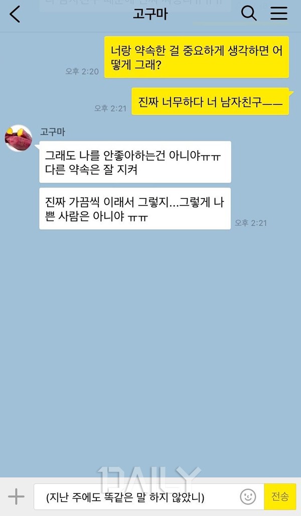 ¿¬¾Ö»ó´ãÀ» ÇØÁÙ ¶§ °¡Àå ´ä´äÇÑ À¯ÇüÀÌ´Ù. ¸¶Ä¡ ¹° ¾øÀÌ ¹ã°í±¸¸¶¸¦ 10°³Âë ¸Ô´Â µíÇÑ ´ä´äÇÔÀ» ÀüÇØÁØ´Ù. ºÐ¸í Ä£±¸ ³²ÀÚÄ£±¸ÀÇ ÇൿÀ» º¸¸é Ä£±¸¸¦ ¼ÒÁßÇÏ°Ô »ý°¢ÇÏÁö ¾Ê´Â °Í °°¾Æ¼ ¸»À» ÇÑ °ÍÀε¥, Ä£±¸´Â "³×°¡ Àß ¸ô¶ó¼ ±×·¡.", "±×·¡µµ ±×·¸°Ô ³ª»Û »ç¶÷Àº ¾Æ´Ï¾ß."¶ó¸ç ÀÚ½ÅÀÇ ³²ÀÚÄ£±¸¸¦ µÎµÐÇÑ´Ù. Ä£±¸ÀÇ À̾߱⸦ µè°í Ä£±¸ ³²ÀÚÄ£±¸ÀÇ Çൿ¿¡ ´ëÇÑ ³» »ý°¢À» ¸»ÇßÀ» »ÓÀε¥, ¼ø½Ä°£¿¡ ³ª¸¸ ³ª»Û »ç¶÷ÀÌ µÈ µíÇÑ ±âºÐÀÌ µç´Ù. ¾î¶² ¸»À» ÇØµµ ³²ÀÚÄ£±¸ ÆíÀ» µé °Å¸é, ³ªÇÑÅ× ¿¬¾Ö»ó´ãÀ» ¿Ö ÇÏ´Â °ÇÁö ¸ð¸£°Ú´Ù.