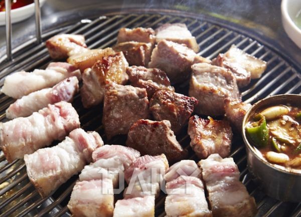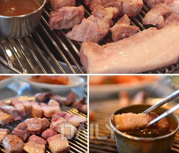 'Ä¥µ·°¡'´Â ÈæµÅÁö¸¦ ¿¬Åº¿¡ ±¸¿ö ¸Ô´Â´Ù. 'Ä¥µ·°¡ ±Ù°í±â'´Â ¹éµÅÁö, 'Èæµµ¾ßÁö ±Ù°í±â'´Â ÈæµÅÁö·Î °í±â¸¦ ÁÖ¹®ÇÏ¸é »õ³¢¼Õ°¡¶ô ±æÀ̸¸ÅÀ̳ª µÎÅùÇÑ °í±â°¡ ºÒÆÇ À§¿¡ ¿Ã·ÁÁø´Ù. ¼ºñ½º·Î ´Þ°¿ÂòÀÌ ³ª¿À°í, ±âº»ÂùÀº °£´ÜÇÑ ÆíÀ¸·Î ¿À·ÎÁö °í±â¿¡¸¸ ÁÖ·ÂÇß´Ù. ¸ñ»ìÀÇ °æ¿ì »ý°í±â¸¦ ±¸¿ö ¸Ô°í, ¿À°ã»ìÀº Ãʹú±¸ÀÌ µÈ °í±â¸¦ ºÒÆÇ¿¡ ´Ù½Ã ±¸¿ö ¸Ô´Â ¹æ½Ä. µÎÅùÇÑ °í±â ¼ÓÀÇ ÃËÃËÇÑ À°ÁóÀÌ °¡µæ ÅÍÁö°í, ¿¬Åº¿¡ ±¸¿ö °í±âÀÇ Âü¸ÀÀÌ ÁøÇÏ°Ô ´À²¸Áø´Ù. Ä¥µ·°¡ÀÇ ¶Ç ´Ù¸¥ º°¹Ì´Â ±èÄ¡Âî°³. ¾óÅ«ÇÏ°í ½Ã¿øÇÑ ±¹¹°¿¡ ÈæµÅÁö°¡ µë»Ò µé¾î Àִµ¥, ¿©±â¿¡ ¶ó¸é»ç¸®¸¦ ³Ö¾î ¸ÔÀ¸¸é ÀÌ ¸À ¶ÇÇÑ ÀÏǰÀÌ´Ù.