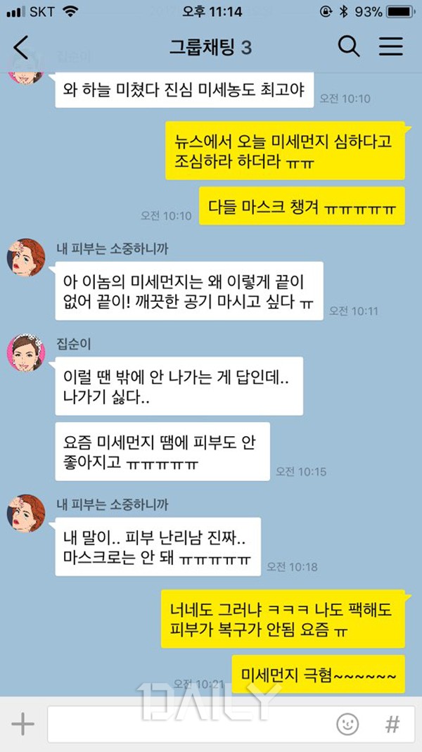 ´ÜÅ广¿¡¼ ÀÚÁÖ µîÀåÇÏ´Â À̾߱â ÁÖÁ¦ Áß¿¡ Çϳª°¡ ³¯¾¾Àε¥, ÃÖ±Ù¿¡´Â ±× Áß¿¡¼µµ ¹Ì¼¼¸ÕÁö ³óµµ°¡ ´Ü°ñ¼Õ´ÔÀÌ µÇ¾ú´Ù. ÁÖ·Î Àú³áÀ̳ª ¹ã¿¡ Àϱ⿹º¸¸¦ º¸¸ç À̾߱âÇϰųª, ´çÀÏ °¡Àå ¸ÕÀú ¿ÜÃâÇÑ Ä£±¸°¡ »óȲÀ» ¾Ë¸®´Â µîÀÇ ½ÄÀÌ´Ù. ¹Ì¼¼¸ÕÁö¸¦ À̾߱â ÇÒ ¶§ ºüÁöÁö ¾Ê°í ¾ð±ÞµÇ´Â °Í Áß Çϳª°¡ ¹Ù·Î ¸¶½ºÅ©¿Í ÇǺÎ. ¸¶Ä¡ 3Á¾ ¼¼Æ®Ã³·³ ºÙ¾î ´Ù´Ï¸ç À̰÷Àú°÷ÀÇ ´ÜÅ广À» Ȱ¼ºÈ½ÃŲ´Ù.