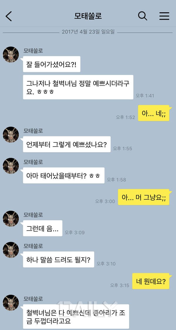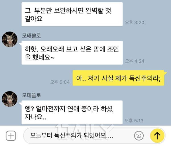 ¼³·¹´Â ¼Ò°³ÆÃ ÈÄ ´Þ´ÞÇÑ ÇÎÅ©ºû ·Î¸Ç½º¸¦ ²Þ²å´Âµ¥ ¾Æ´Ï ÀÌ°Ô À¢ÀÏ? Çì¾îÁø ÈÄ Ã³À½ ¿Â Ä«Åå ³»¿ëÀÌ ½É»óÄ¡ ¾Ê´Ù. »ó´ë¹æÀÇ ¸¶À½¿¡ ºñ¼ö¸¦ ²È´Â ÇൿÀº ³ªÁß¿¡ ´õ Å« ºñ¼ö°¡ µÇ¾î ³ª¿¡°Ô ²ÈÈú ¼ö ÀÖÀ¸´Ï ¼Ò°³ÆÃ ÈÄ ¸¶À½¿¡ µéÁö ¾Ê¾Æµµ ÃÖ¼ÒÇÑÀÇ ¿¹ÀǸ¦ ÁöÄÑ ¸»ÇÏ´Â °ÍÀÌ Áß¿äÇÏ´Ù. ºñ¸Å³Ê ÁßÀÇ ºñ¸Å³Ê! »ó´ë¹æÀÇ ±âºÐÀº ÀüÇô ¹è·ÁÇÏÁö ¾Ê°í ÀÚ½ÅÀÇ Àǰ߸¸ Á÷¼³ÀûÀ¸·Î ³»¹ñ´Â ºñ¸Å³Ê Ä«Åå À¯ÇüÀ» ¸ð¾ÆºÃ´Ù.