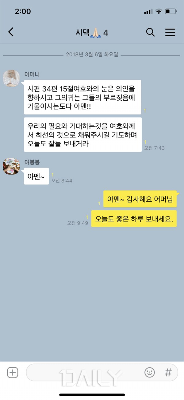 ³»°¡ Á¾±³°¡ ÀÖµç ¾øµç »ó°ü¾øÀÌ ´Ã ¾ÆÄ§¸¶´Ù ¼º°æ ¸»¾¸ ÇÑ ±¸Àý¾¿°ú ±âµµ¸¦ ÇØ ÁÖ´Â »ç¶÷µµ ÀÖ´Ù. ÇÑâ Ãâ±Ù Áغñ·Î ¹Ù»Û ¾ÆÄ§ ½Ã°£¿¡ º¸³»´Â °æ¿ì°¡ ¸¹¾Æ ÀÏÀÏÀÌ ´äº¯À» º¸³»´Â °Ô Èûµé ¶§µµ ÀÖÁö¸¸ ±× ¼ö°í½º·¯¿òÀ» ¾Ë±â¿¡ ´Ê´õ¶óµµ ¾Æ¸à~°¨»çÇÕ´Ï´Ù~¶ó´Â ¸Þ½ÃÁö¸¦ º¸³»±âµµ ÇÑ´Ù. ´Ù¸¸ Á¾±³°¡ ¾ø´Â »ç¶÷¿¡°Ô ¸Å¹ø ¹Ýº¹ÀûÀÎ ¸Þ½ÃÁö¸¦ º¸³»´Ù º¸¸é ±×³¯ÀÇ ÄÁµð¼Ç¿¡ µû¶ó ±¦È÷ ¿íÇϱ⵵ ÇÑ´Ù´Â °Ô ÇÔÁ¤À̶ó¸é ÇÔÁ¤ÀÌ´Ù.