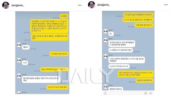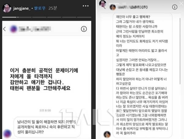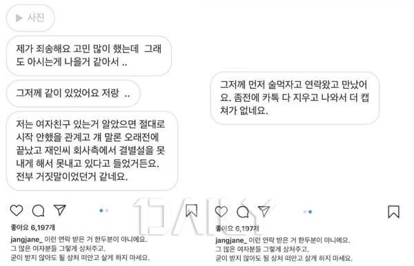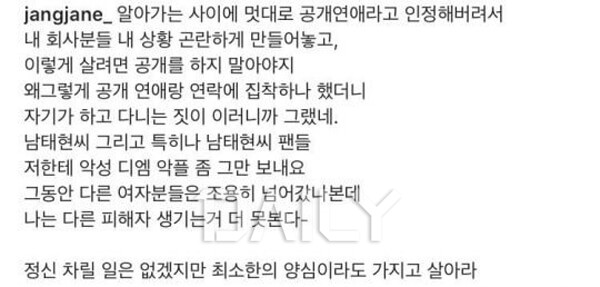 A¾¾´Â ¸Þ½ÃÁö¸¦ ÅëÇØ ³²ÅÂÇöÀÌ "¿À·¡Àü¿¡ (µÑ »çÀ̰¡) ³¡³µ°í ÀçÀξ¾ ȸ»ç Ãø¿¡¼ °áº°¼³À» ¸ø³»°Ô ÇØ¼ ¸ø ³»°í ÀÖ´Ù"°í °ÅÁþ¸»Çß´Ù¸ç ¹Ì¾ÈÇÏ´Ù´Â ÀÔÀåÀ» ÀüÇß´Ù. ÀåÀçÀÎÀº ÇØ´ç ¸Þ½ÃÁö¸¦ ±×´ë·Î ĸóÇÏ¿© ÀÚ½ÅÀÇ °èÁ¤¿¡ °Ô½ÃÇϸç "ÀÌ·± ¿¬¶ô¹ÞÀº °Å ÇѵΠºÐÀÌ ¾Æ´Ï¿¡¿ä."¶ó°í µ¡ºÙ¿© ³²ÅÂÇöÀÇ ÀÌ·¯ÇÑ ºñµµ´öÀûÀÎ ÇൿÀÌ Ã³À½ÀÌ ¾Æ´ÔÀ» ¾Ë·È´Ù. ÀÌ¿¡ ´©¸®²ÛµéÀº "³²ÅÂÇö °°Àº ³²ÀÚ ¸¸³ª¸é Àλý ²¿ÀδÙ", "ÀåÀçÀÎ ¾¾ ¿ë±â ¸ÚÀÖ´Ù. °°Àº ÇÇÇØÀÚ°¡ ´õ ÀÌ»ó ³ª¿ÀÁö ¾Ê¾ÒÀ¸¸é ÁÁ°Ú´Ù" µîÀÇ ¹ÝÀÀÀ» º¸À̸ç ÀåÀçÀÎÀÇ Æø·Î¸¦ ÀÀ¿øÇÏ´Â ÀÔÀåÀ» ³»ºñÃÆ´Ù.