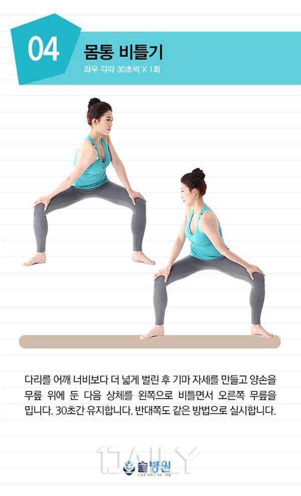 ´Ù¸®¸¦ ÃÖ´ëÇÑ ¹ú¸° µÚ¿¡ ¹Ù´Ú¿¡ ¾É´Â´Ù. ¿À¸¥ÆÈÀº ¸Ó¸® À§·Î µé¾î µÕ±Û°Ô ¸¸µé°í, ¿ÞÆÈÀº ¿ÞÂÊÀÇ ¹ß¸ñ ÂÊÀ¸·Î Âß »¸´Â´Ù. ÀÌ »óÅ¿¡¼ »óü´Â ¿ÞÂÊÀ¸·Î õõÈ÷ ÃÖ´ëÇÑ ±â¿ïÀδÙ. »óü´Â ¾ÕÀ¸·Î ¼÷¿©ÁöÁö ¾Êµµ·Ï ±ÕÇüÀ» ¸ÂÃß¸é¼ ÁÂ¿ì °¢ 10ȸ¾¿ ¿·±¸¸® ´Ã¸®±â¸¦ ¹Ýº¹ÀûÀ¸·Î ½Ç½ÃÇÑ´Ù.