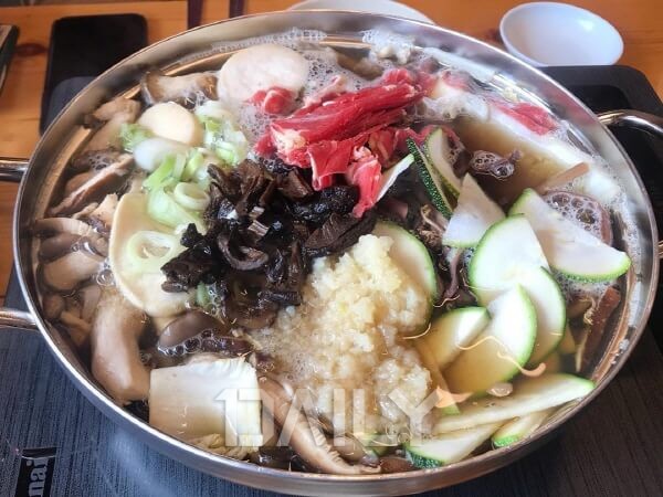 ¹ö¼¸°ú ¼Ò°í±â°¡ µé¾î°£ Àü°ñÀÌ À¯¸íÇÑ °÷À¸·Î °Ç°ÇÑ º¸¾ç½Ä °°Àº ½Ä»ç¸¦ ÇÒ ¼ö ÀÖ´Â ½Ä´çÀÌ´Ù. ´Ù¼Ò Çã¸§ÇØ º¸ÀÌ´Â °¡°ÔÀÌÁö¸¸ ¸Þ´º¿Í ±¸¼ºÀº ¾ÆÁÖ ¾ËÂ÷´Ù. °®°¡Áö ¾àÃÊ·Î ¸¸µç À°¼ö¿Í ¿©·¯ Á¾·ùÀÇ ¹ö¼¸ÀÌ µé¾î°£ ¹ö¼¸Àü°ñÀº ±¹¹°ÀÌ ÁøÇϸ鼵µ ±ò²ûÇÏ¸ç °Ç°ÇÑ ¸ÀÀÌ´Ù. ¼ºñ½º·Î ³ª¿À´Â ¹ö¼¸¹ä°ú Àü°ñÀ» ÁÖ¹®Çϸé ÇÔ²² Á¦°øµÇ´Â ¾àÃÊ¹ä ¶ÇÇÑ ¾ÆÁÖ µçµçÇÏ´Ù. Àü°ñÀº °£ÀÌ ½Ì°Ì±â ¶§¹®¿¡ °Ç´õ±â¸¦ °£Àå¿¡ µû·Î Âï¾î »þºê»þºê ¹æ½ÄÀ¸·Î ¸ÔÀ¸¸é ´õ¿í ¸ÀÀÖ°Ô Áñ±æ ¼ö ÀÖ´Ù.