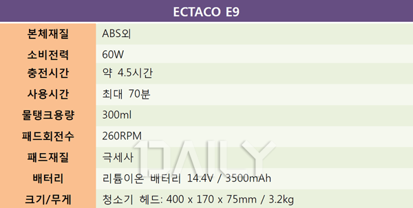 ÇÏÁö¸¸ ¹«¼± û¼Ò±â´Â ¹«¼±À¸·Î ±¸µ¿ÀÌ °¡´ÉÇØ¾ß Çϱ⠶§¹®¿¡ Àü¿ø ¹èÅ͸®°¡ º»Ã¼¿¡ ºÎÂøµÇ¾î ÀÖ¾î ¹«°Ô°¡ ¹«°Ì°í, ÃæÀü½ÄÀ¸·Î ÀÛµ¿ÇØ ¿À·£ ½Ã°£ ÀÌ¿ëÇÒ ¼ö ¾ø´Ù´Â ´ÜÁ¡ÀÌ ÀÖ´Ù. ±×·¯³ª ¿¢Å¸ÄÚ ¹«¼± û¼Ò±â E9Àº ¼¼°è ÃÖÃÊ·Î ¹èÅ͸® ºÐ¸®Çü ¼³°è°¡ Àû¿ëµÇ¾î ÀÌ·¯ÇÑ ¹«¼± û¼Ò±âÀÇ ´ÜÁ¡À» Å©°Ô º¸¿ÏÇß´Ù. ¼Õ½±°Ô Å»ºÎÂø °¡´ÉÇÑ ¹èÅ͸®´Â ÄÞÆÑÆ®ÇÑ »çÀÌÁ ÀÚ¶ûÇÒ »Ó¸¸ ¾Æ´Ï¶ó ÇÑ ¹øÀÇ ¿ÏÃæ¸¸À¸·Î ¹«·Á 60ºÐ°¡Áö ¿¬¼Ó »ç¿ëÀÌ °¡´ÉÇÏ´Ù. ¶ÇÇÑ ¹Ï°í »ç¿ëÇÒ ¼ö ÀÖ´Â »ï¼ºSDI ¹èÅ͸®¸¦ Àû¿ëÇÏ¿© ¹ß¿ ¹× Æø¹ß µîÀÇ °ÆÁ¤ ¾øÀÌ ¾ÈÀüÇÏ°Ô ÀÌ¿ëÇÒ ¼ö ÀÖ´Ù.