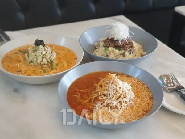 ÀÛ°í ¾Æ´ãÇÑ ±Ô¸ðÀÌÁö¸¸ ¸ÀÀÖ´Â ÆÄ½ºÅ¸¿Í ¸®Á¶¶Ç µîÀ» ¸Àº¼ ¼ö ÀÖ´Â ½Ä´çÀ¸·Î ²Ï ÀÔ¼Ò¹®ÀÌ ¸¹ÀÌ ³ª ÀÖ´Â °÷ÀÌ´Ù. »§°ú »ø·¯µå¸¦ Á¦¿ÜÇÏ¸é ÆÄ½ºÅ¸¿Í ¸®Á¶¶Ç ¸î Á¾·ù°¡ ÀüºÎÀÎ °£´ÜÇÑ ¸Þ´º·Î ±¸¼ºµÅ ÀÖÀ¸¸ç °¡°ÝÀº Àú·ÅÇÑ ÆíÀÌ´Ù. ÆÄ½ºÅ¸´Â ¸ðÂ¥·¼¶ó¿Í ¼Ò°í±â¿¡ Å丶Åä¼Ò½º¸¦ ´õÇÑ ¸ðÂ¥·¼¶ó º¼·Î³×Á¦ºÎÅÍ ¹ÙÁúÆä½ºÅä ¼Ò½º¸¦ ³ÖÀº ġŲÆä½ºÅä ·ÎÁ¦Å©¸², û¾ç½¬¸²ÇÁ Å©¸² µîÀÌ ÀÖÀ¸¸ç ¸®Á¶¶Ç´Â ƯÈ÷ Å©¸²¼Ò½º ¸®Á¶¶Ç¿¡ Á÷È·Î ±¸¿î ºÒ°í±â ÅäÇÎÀ» ¿Ã¸° ºÒ°í±â Å©¸²ÀÌ Àαâ ÀÖ´Ù.