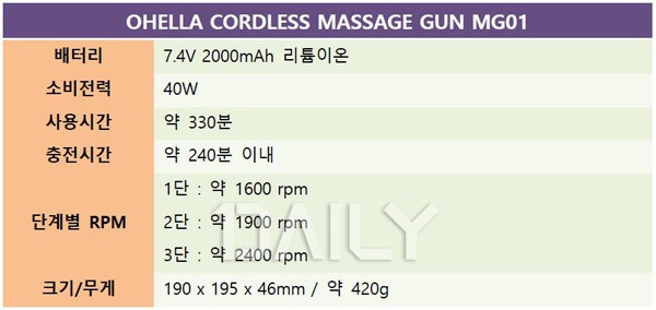 ¿À¿¤¶ó ¹«¼± Áøµ¿ ¸¶»çÁö°ÇÀº Å©±âµµ °úÇÏÁö ¾Ê°í ¹«°Ôµµ ¾à 420gÀ¸·Î °¡º¿ö¼ ¿©¼ºµµ ºÎ´ã ¾øÀÌ ÇÑ ¼ÕÀ¸·Î µé°í »ç¿ëÇÒ ¼ö ÀÖ´Ù. ¶ÇÇÑ Áøµ¿ ¸¶»çÁö°Ç Áß¿¡¼´Â ¼ÒÀ½ ¹ß»ýµµ ¾à 52dB·Î Àú¼ÒÀ½¿¡ ¼ÓÇØ ¿©·µÀÌ ÇÔ²² ÀÖ´Â Àå¼Ò¿¡¼µµ ÁÖº¯¿¡ ¼ÒÀ½ ÇÇÇØ¸¦ ÁÖÁö ¾Ê°í »ç¿ëÇÒ ¼ö ÀÖÀ¸¸ç È¥ÀÚ Áý¿¡¼ ¿µÈ³ª TV¸¦ Áñ±â¸é¼µµ ¾µ ¼ö ÀÖ´Ù.
