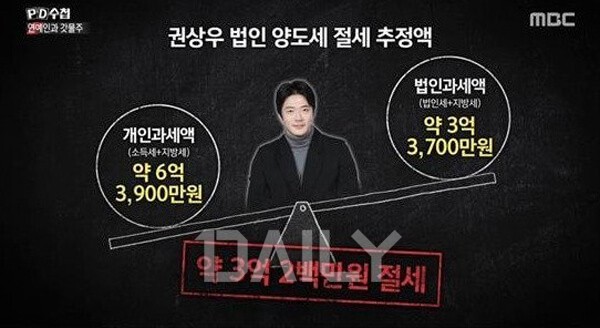 ¿¹¸¦ µé¾î ¹è¿ì ±Ç»ó¿ì°¡ ¼¿ï °¼±¸¿¡ À§Ä¡ÇÑ 260¾ï ¿ø »ó´çÀÇ °Ç¹°À» ÆÇ´Ù°í °¡Á¤Çغ¸ÀÚ. ¸¸¾à ÀÌ °Ç¹°ÀÌ ±Ç»ó¿ìÀÇ °³ÀÎ ¼ÒÀ¯ °Ç¹°À̶ó¸é, °Ç¹°À» ÆÇ¸ÅÇÒ ¶§ ¾çµµ¼Òµæ¼¼¿Í Áö¹æ¼¼¸¦ Æ÷ÇÔÇØ ¾à 6¾ï 3,900¸¸ ¿øÀÇ ¼¼±ÝÀ» ³»¾ß ÇÑ´Ù. ±×·¯³ª ÀÌ °Ç¹°Àº ±Ç»ó¿ì°¡ ÇѶ§ ´ëÇ¥ÀÌ»ç·Î ÀÖ¾ú°í, ÇöÀç´Â »ç³»ÀÌ»ç·Î µî·ÏµÇ¾î ÀÖ´Â ¸Å´ÏÁö¸ÕÆ® KÇʸ§ ¼ÒÀ¯ÀÇ °Ç¹°ÀÌ´Ù. µû¶ó¼ °Ç¹°À» ÆÇ¸ÅÇÏ´õ¶óµµ ¹ýÀÎ ¼ÒÀ¯ÀÇ °Ç¹°À̱⠶§¹®¿¡ ¾à 3¾ï 3,700¸¸ ¿øÀÇ ¼¼±Ý¸¸ ºÎ°úµÈ´Ù. ½±°Ô ¸»ÇØ °Ç¹°À» ¸ÅÀÔÇÒ ¶§ °³ÀÎÀÌ ¾Æ´Ñ ¹ýÀÎ ¸íÀÇ·Î °Ç¹°À» ±¸ÀÔÇßÀ¸´Ï, °Ç¹°À» µÇÆÈ ¶§µµ 3¾ï 200¸¸ ¿øÀÇ ¼¼±ÝÀ» ÁÙÀÏ ¼ö ÀÖ´Â °ÍÀÌ´Ù.