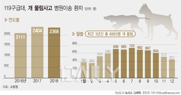 Áß¾ÓÀϺ¸ÀÇ º¸µµ±â»ç¿¡ µû¸£¸é, ±¹È¸ ³ó¸²Ãà»ê½ÄÇ°ÇØ¾ç¼ö»êÀ§¿øÈ¸ ¹«¼Ò¼Ó ¼Õ±ÝÁÖ ÀÇ¿øÀÌ ³ó¸²Ãà»ê½ÄǰºÎ·ÎºÎÅÍ Á¦Ãâ¹ÞÀº ÀڷḦ ºÐ¼®ÇÑ °á°ú, Áö³ 2014³âºÎÅÍ 5³â µ¿¾È 1¸¸ 614¸íÀÌ °³ ¹°¸² »ç°í¸¦ ´çÇÑ °ÍÀ¸·Î Áý°èµÆ´Ù. ±¸Ã¼ÀûÀ¸·Î 2014³â 1889¸í, 2015³â 1842¸í, 2016³â 2111¸í, 2017³â 2404¸í, 2018³â 2368¸íÀ̾úÀ¸¸ç ¸Å³â Áõ°¡¼¼¸¦ ³ªÅ¸³»°í ÀÖ´Ù.