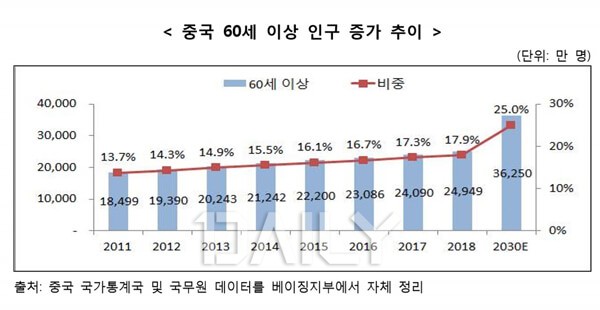 Áß±¹Àº 65¼¼ ÀÌ»ó ³ë³â Àα¸ ºñÁßÀÌ °è¼ÓÇØ¼ Áõ°¡Çϰí ÀÖ´Â ³ª¶ó Áß Çϳª´Ù. À¯·Î¸ð´ÏÅÍ µî¿¡ µû¸£¸é, 2018³â Áß±¹ÀÇ 65¼¼ ÀÌ»ó ³ë³â Àα¸´Â 1¾ï 5800¸¸ ¸íÀ̸ç Àüü Àα¸ 13¾ï 9000¸¸ ¸í Áß¿¡¼ 11.3%¸¦ Â÷ÁöÇÑ´Ù. 2030³â¿¡´Â Áß±¹ Àüü Àα¸ 14¾ï Áß 65¼¼ ÀÌ»ó ³ë³â Àα¸¼ö°¡ 2¾ï4300¸¸ ¸íÀ¸·Î Àüü Àα¸ÀÇ 17.4%¿¡ ´ÞÇÒ °ÍÀ¸·Î Àü¸ÁµÇ°í ÀÖ´Ù.