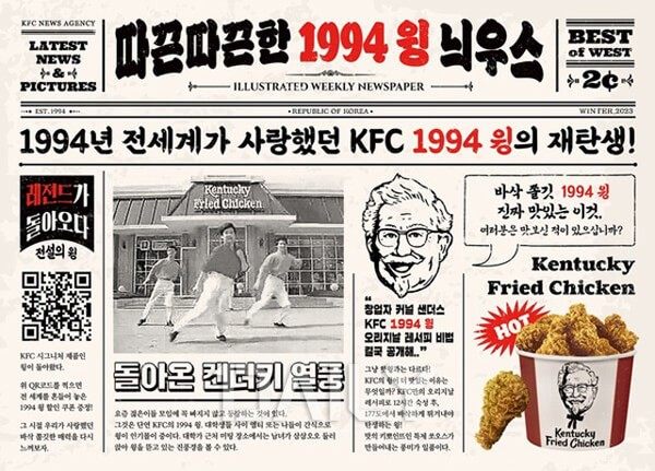 KFC´Â ÇÖ À®À» ´õ¿í ¹Ù»èÇϰí Â̱êÇØÁø ¡®1994 À®¡¯À¸·Î »õ·Ó°Ô Ãâ½ÃÇß´Ù. KFC ÇÖ À®Àº ³²³à³ë¼Ò ºÎ´ã ¾øÀÌ Áñ±æ ¼ö ÀÖ´Â ¸ÀÀ¸·Î Àü ¼¼°è¿¡¼ Å« »ç¶ûÀ» ¹ÞÀº KFCÀÇ ½Ã±×´Ïó ¸Þ´º´Ù. ±¹³»¿¡´Â 1993³â óÀ½ ¼±º¸ÀÎ ¹Ù ÀÖ´Ù. À̹ø¿¡ ¸®´º¾óµÈ 1994 À®Àº KFC¸¸ÀÇ Á¶¸® ºñ¹ýÀ¸·Î ´õ¿í Â̱êÇϸ鼵µ ¹Ù»èÇÑ ½Ä°¨À» »ì¸° °ÍÀÌ Æ¯Â¡ÀÌ´Ù. â¾÷ÀÚ Ä¿³Î »÷´õ½ºÀÇ ¿À¸®Áö³Î ·¹½ÃÇǸ¦ ¹Ý¿µÇß´Ù. ¸ÅÀå ÆÇ¸Å°¡´Â 4Á¶°¢ ±âÁØ 6,500¿øÀÌ´Ù.